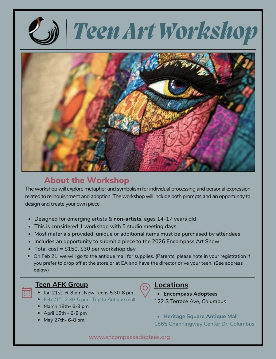 The 2026 annual Encompass Adoptee Art Show will be held on November 7th. A call to community artists will be posted later in the year.