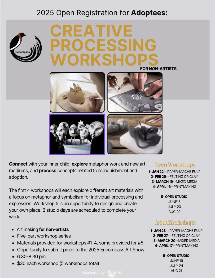 Adult Adoptee Art Workshop Thursday, January 23, 2025 6:30 PM 8:30 PM Encompass Adoptees 122 South Terrace Avenue, Unit 1 Columbus, OH, 43204 United States (map) Google Calendar ICS