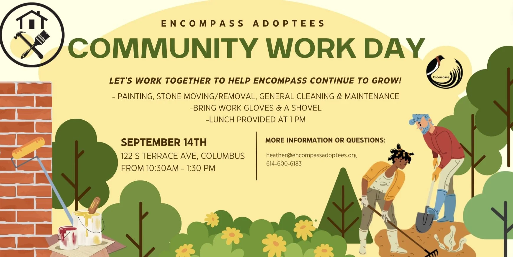 Encompass Community Work Day Saturday, September 14, 2024 10:30 AM 1:30 PM Encompass Adoptees 122 South Terrace Avenue, Unit 1 Columbus, OH, 43204 United States (map) Google Calendar ICS